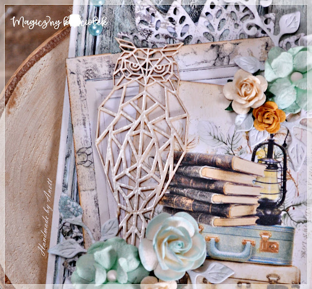 Wykorzystałam tutaj papiery Mintay oraz dwie tekturki: serwetkę z obwódką oraz geometryczną sowę.
