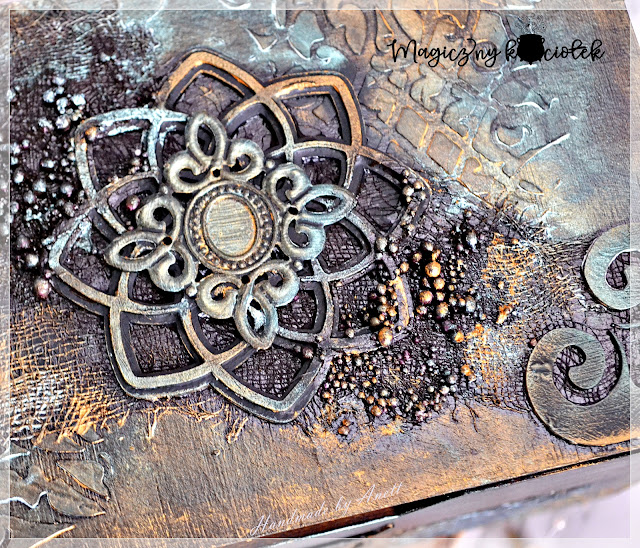 oraz woski. Przez maskę zrobiłam wzór, dodałam oczywiście tekturki i metalowy element na tekturce.